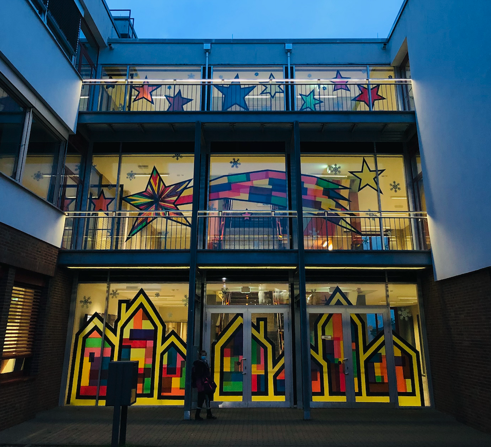 Auch in diesem Jahr haben die Schülerinnen und Schüler der Otto-Hahn-Realschule plus Bitburg sich wieder alle Mühe gegeben, ihre Schule weihnachtlich zu schmücken. Viele fleißige Hände haben die fast 15m hohe Glasfassade in ein stimmungsvolles Meisterwerk verwandelt. Jeden Morgen begrüßt nun ein farbenfrohes Adventskunstwerk mit einem riesigen Kometen die Schülerinnen und Schüler auf Ihrem Weg in die Schule. Doch auch die Gäste des Cascade-Bads werden sicher, wie in jedem Jahr, einen wohlwollenden Blick auf die leuchtenden Farben und rieselnden Schneeflocken werfen.