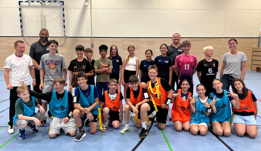 Ein plötzlicher Wetterumschwung mit Gewitter zwang die Gruppe dazu, vom Stadion in die Sporthalle auszuweichen. Der guten Stimmung tat das keinen Abbruch – ganz im Gegenteil: In der Halle konnten die Kinder erste richtige Spielerfahrungen sammeln und lernten dabei wichtige Regeln des Spiels kennen.