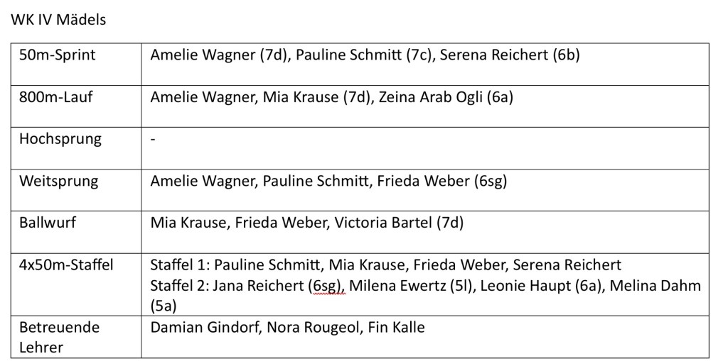 Bei den Mädels erreichte der WK IV der Jahrgänge 2012 und jünger am 26.6. in Konz den fünften Platz. Amelie Wagner gelang ein Fabelsprung auf 4,74m. Über 50m brillierte sie in 7,37s wie Pauline Schmitt in 7,54s. Ein kurzfristiger krankheitsbedingter Ausfall einer Topathletin kostete uns letztlich wie die Fehler bei der Staffelübergabe der ersten Staffel den Sieg bzw. den Podestplatz.