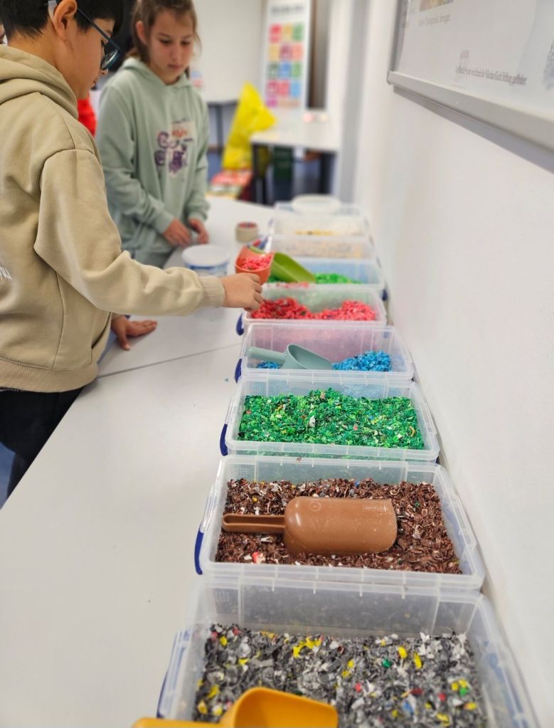 Nach einem kurzen, interaktiven Einstieg zum Thema „Plastik im Alltag“ starteten die Schülerinnen und Schüler in ein abwechslungsreiches Stationenlernen, in dem sie sich aktiv mit dem Werkstoff Kunststoff auseinandersetzten. So sortierten sie unterschiedliche Plastikarten, trainierten ihr Wissen in einem thematischen Memory-Spiel und erhielten beim Weltverteilungsspiel spannende Einblicke in die globale Verteilung von Plastikproduktion und -verbrauch.