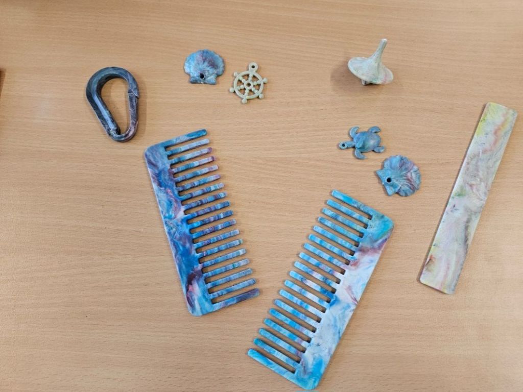 Das Highlight des Tages war jedoch der hautnah miterlebte Recyclingprozess. Gemeinsam mit Angie Jensen, der Projektleiterin, und ihrem Team begleiteten die Kinder ihr eigens mitgebrachtes Plastik auf dem Weg zu einem neuen Produkt. Das Material wurde zuerst zu Granulat zerkleinert, anschließend in einer Injektionspumpe erhitzt und schließlich in verschiedene Formen gegossen. So entstanden Schritt für Schritt neue, praktische Alltagsgegenstände – vom Lineal über den Kamm bis hin zum Schlüsselanhänger. Die Begeisterung war groß, als die Schülerinnen und Schüler ihre selbst recycelten Unikate in den Händen hielten.