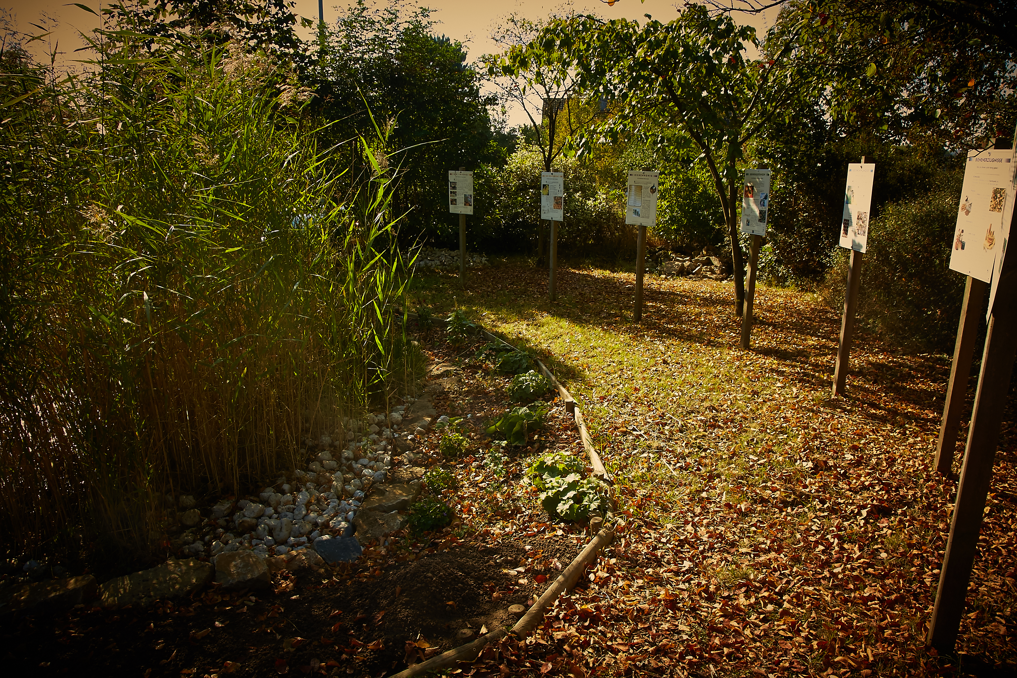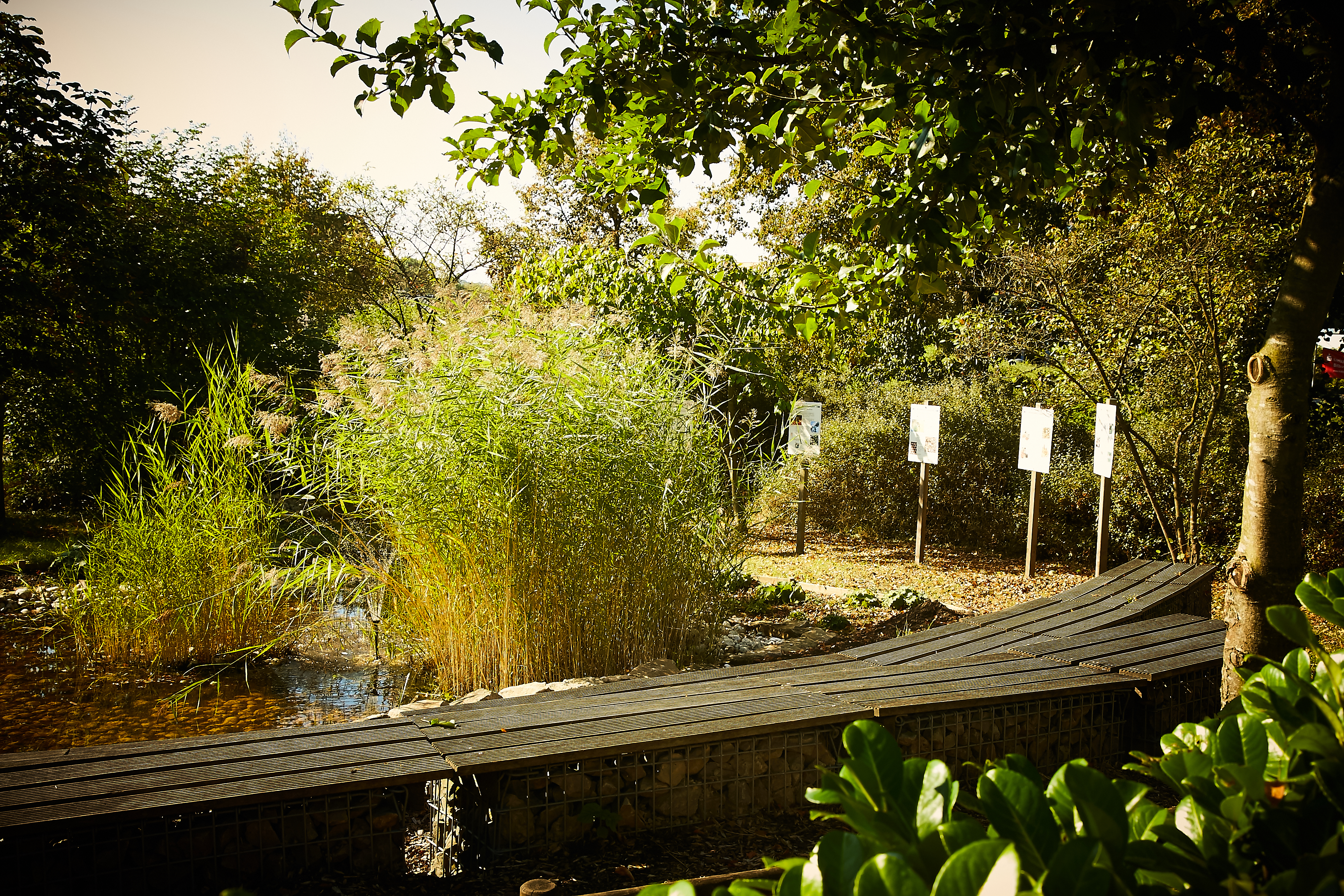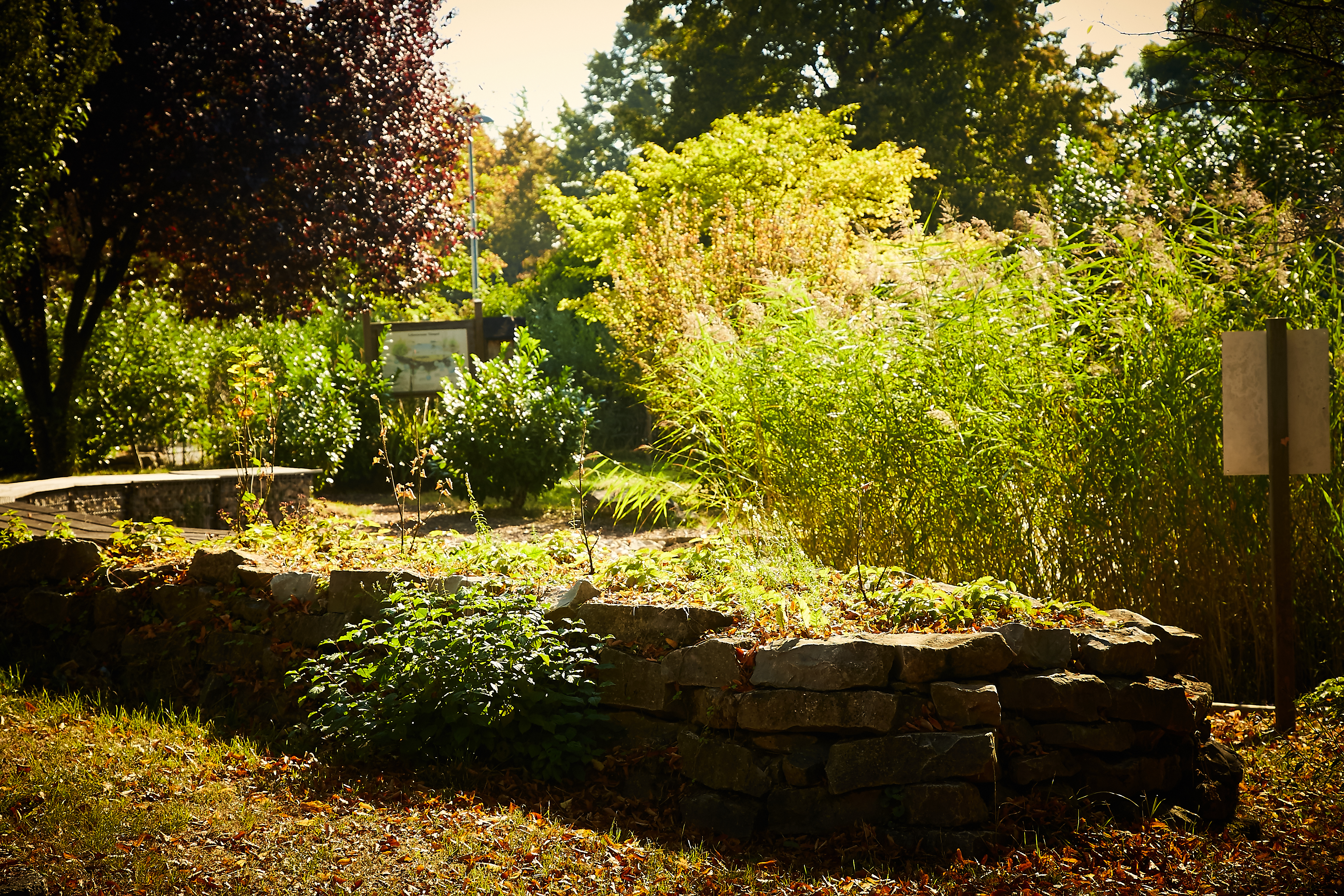 Es wurden Bäume gefällt, Hecken und Buschwerk entfernt, ein Teich wurde angelegt und eine Stützmauer naturnah erstellt. Entlang eines Pfades wurden Beete platziert, sowie Lehrtafeln aufgestellt.